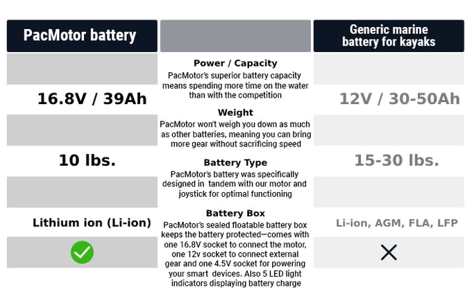 At 16.8V and 39Ah, This battery power and capacity surpass other generic marine batteries. This means more time on the water and more thrust for your kayak.
