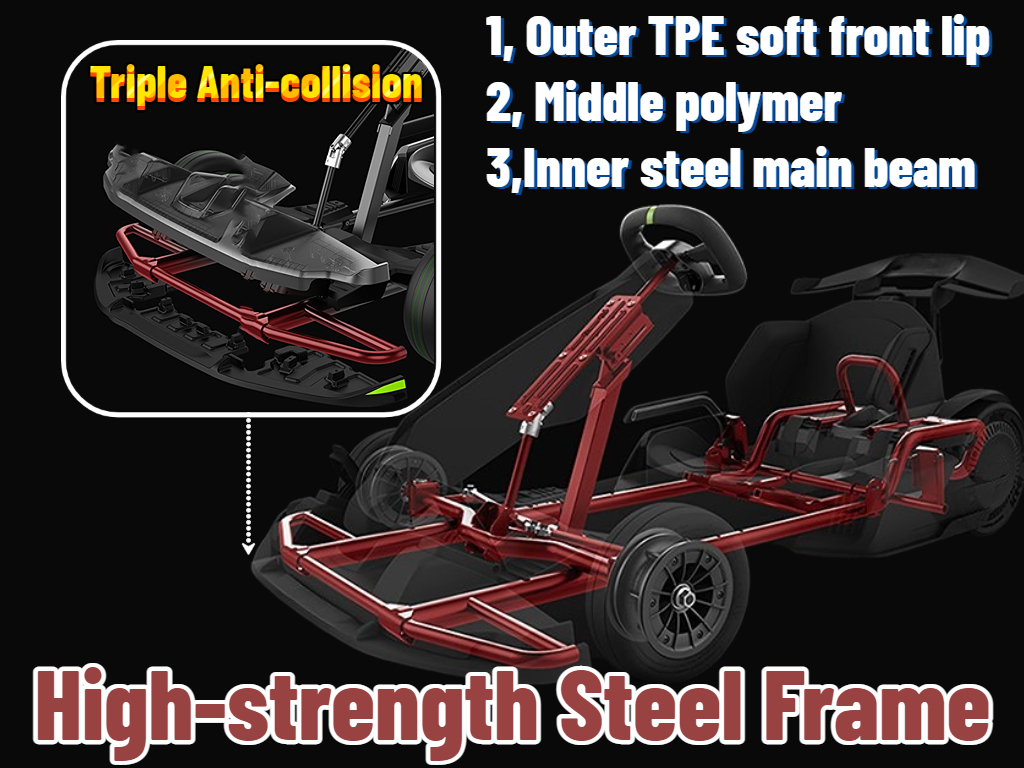 The go-kart uses a high-strength steel frame that can carry a maximum weight of 330lb(150kg). The front of the go-kart adopts a triple anti-collision protection and energy-absorbing design, efficiently cushioning and protecting the everyone's safety.