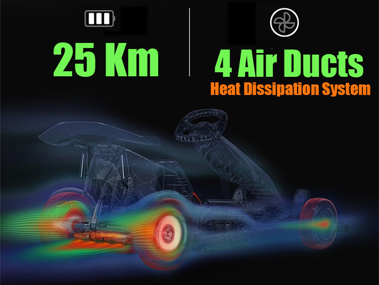 The go-kart has a large capacity air-cooled battery pack(432Wh) that can run 15.5 miles(25Km) each time, making it more durable and smoother. The battery pack uses a 4-way air passage cooling design to ensure stable energy supply, even at the vehicle's top speed. Super Fast Charge® technology takes only 45 minutes to complete charging (110V 60Hz). Reversible charging for other devices such as cell phones.